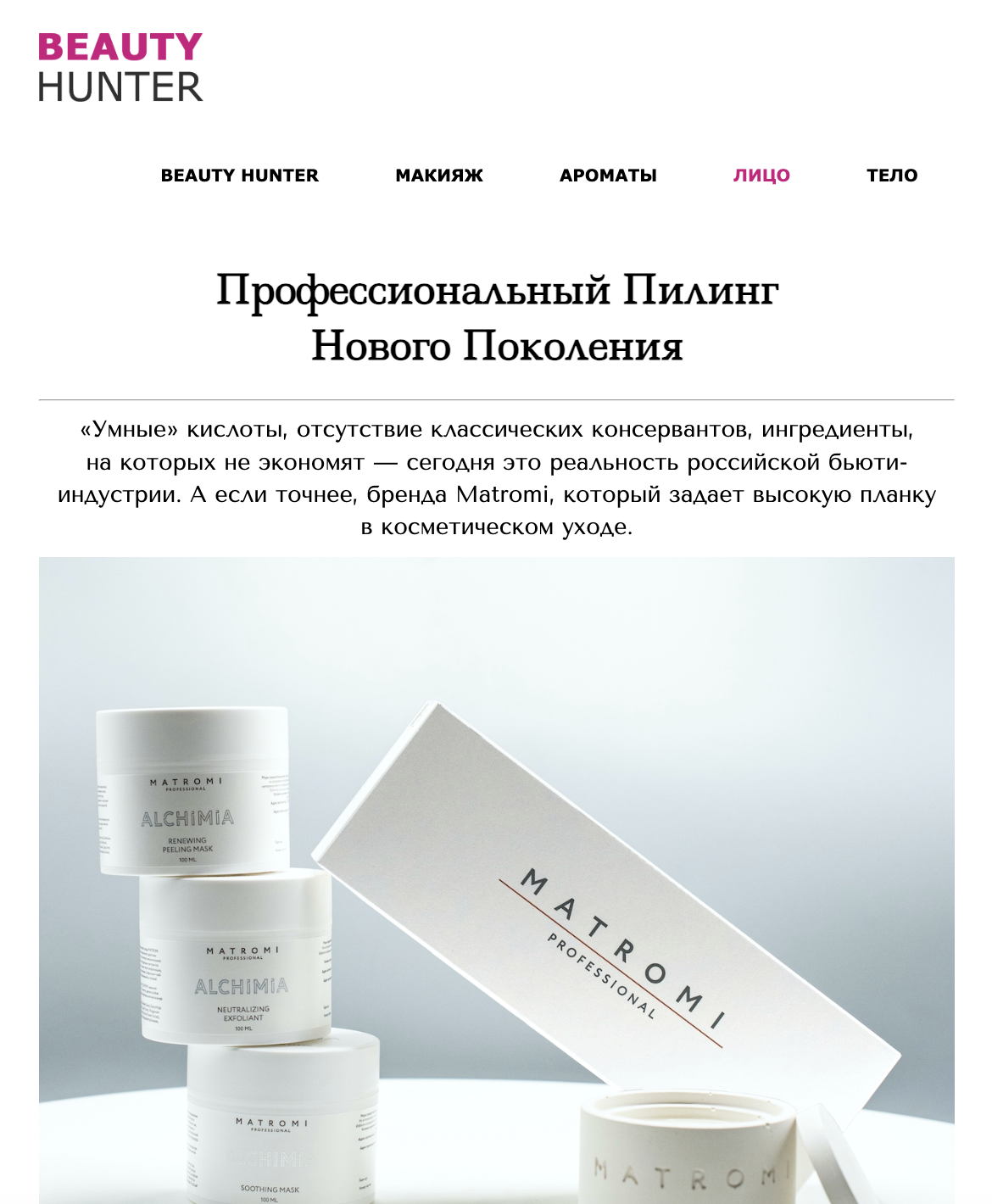 Не так давно у Matromi вышла новинка в профессиональном уходе — трёхэтапная система обновления кожи «ALCHIMIA». Процедура деликатно преображает кожу: повышает ее упругость, гладкость и сияние, выравнивает тон, глубоко очищает, придает ощущение свежести — словом, мгновенное обновление кожи для эффектного выхода «в свет».